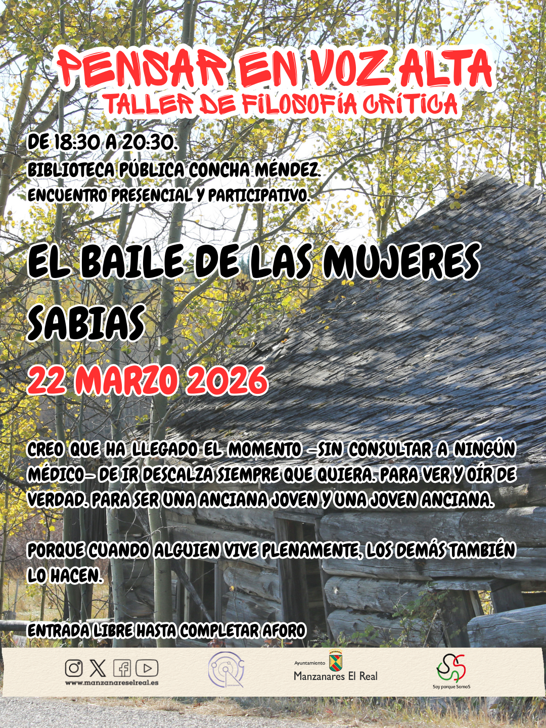 Ofrecer un espacio quincenal de reflexión filosófica accesible a toda la ciudadanía en OBJETIVOS ESPECÍFICOS Acercar la filosofía a personas de todas las edades y formaciones. Fomentar el diálogo entre vecinos y vecinas a partir de preguntas esenciales. Estimular el pensamiento autónomo, creativo y ético. Generar contenido cultural en formato podcast desde Manzanares el Real. Revalorizar los espacios públicos como foros de pensamiento colectivo. DESCRIPCIÓN DEL TALLER Periodicidad: Dos domingos al mes. Horario: De 18:30 a 20:30. Lugar: Biblioteca Pública Municipal Concha Méndez. Formato: Encuentro presencial con participantes sentados en círculo. Se plantea una introducción teórica breve, seguida de dinámicas de diálogo filosófico, lectura de textos breves, debates o ejercicios de pensamiento compartido. Temas: Acceso: PERFIL DE L@S FACILITADOR@S Profesionales o docentes del ámbito de la filosofía, las humanidades o la educación con experiencia en DOCENCIA y PENSAMIENTO CRÍTICO. Se prioriza un enfoque JUSTIFICACIÓN En un contexto de sobreinformación, polarización y desconexión comunitaria, el Inicio del taller: octubre 2025. Octubre Desde que somos diálogo. Noviembre Te mentiría si te digo la verdad. Gamestart: Con los juegos comienza todo. Diciembre Humanos al borde de un ataque de nervios. Esperanza activa. Enero Sociedad del cansancio. Ni tan racional ni tan espiritual. Febrero Anarquismo en la India. Marzo Las otras voces. La retórica es femenina. Abril Guerra de sexos. La mujer sin amo. Mayo El baile de las mujeres. Mi familia y otros animales. Junio Educad@s Tema PropuestoPensar en voz alta: Taller de Filosofía y Podcast en la Biblioteca